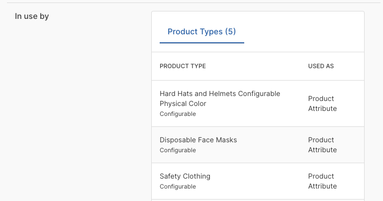 You can now view where a product attribute is being used. On the Attribute Details page, the "In use by" table shows each product type using an attribute.