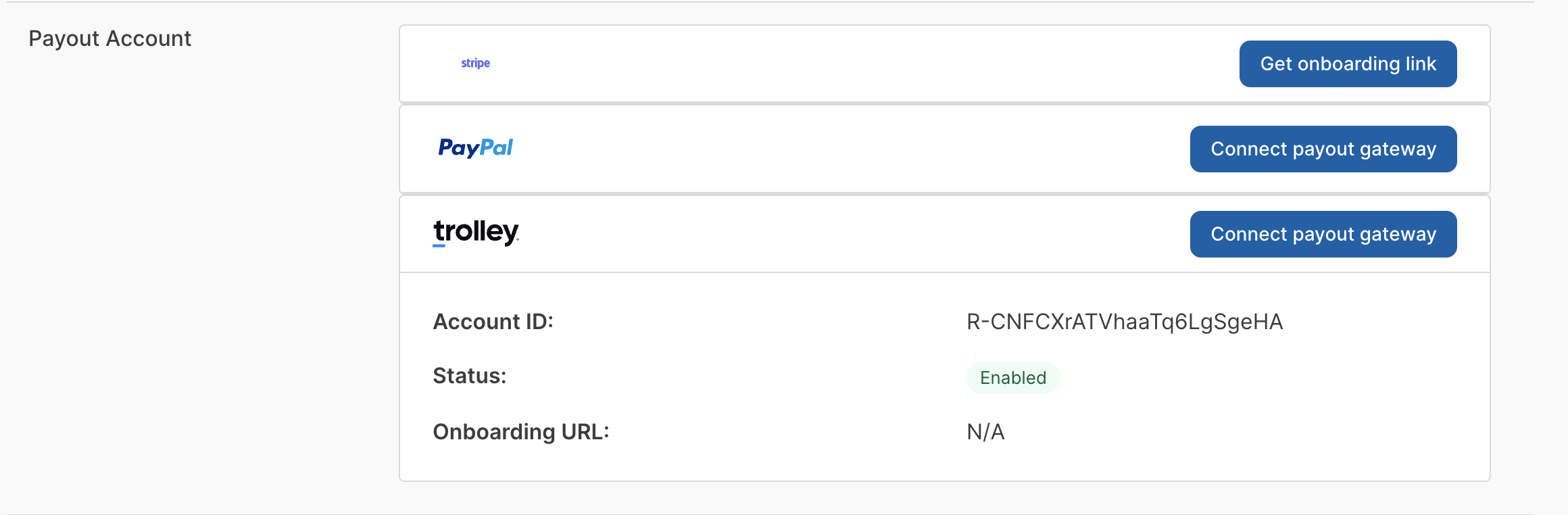 Added the ability to connect to Trolley as your payout gateway from the app marketplace. Once connected, sellers can connect to Trolley as their payout account from their vendor settings.