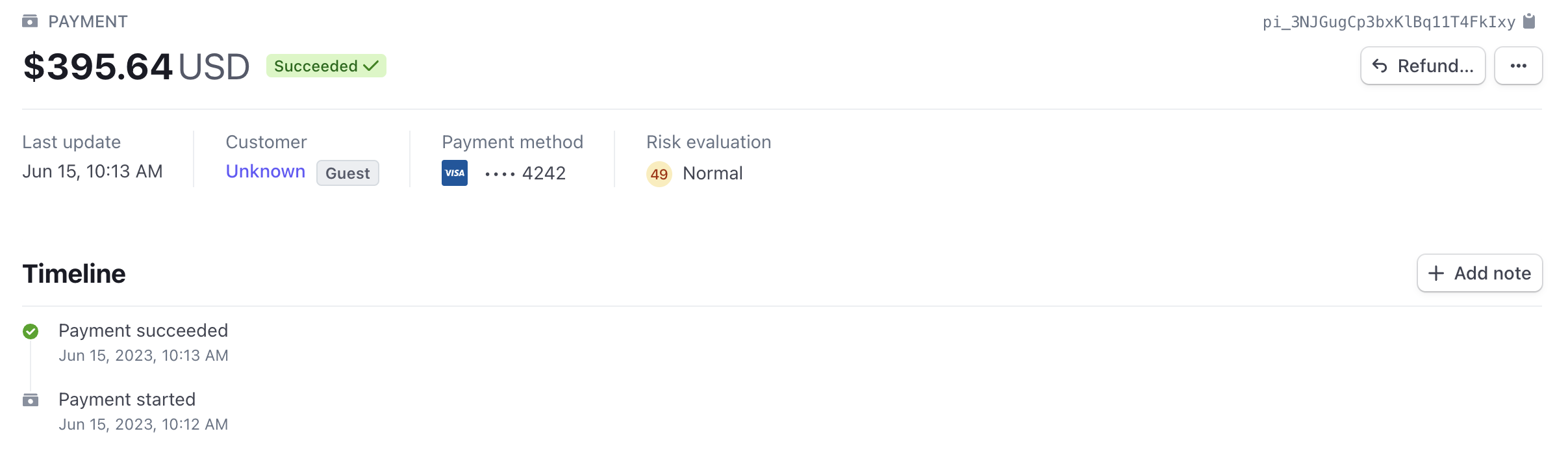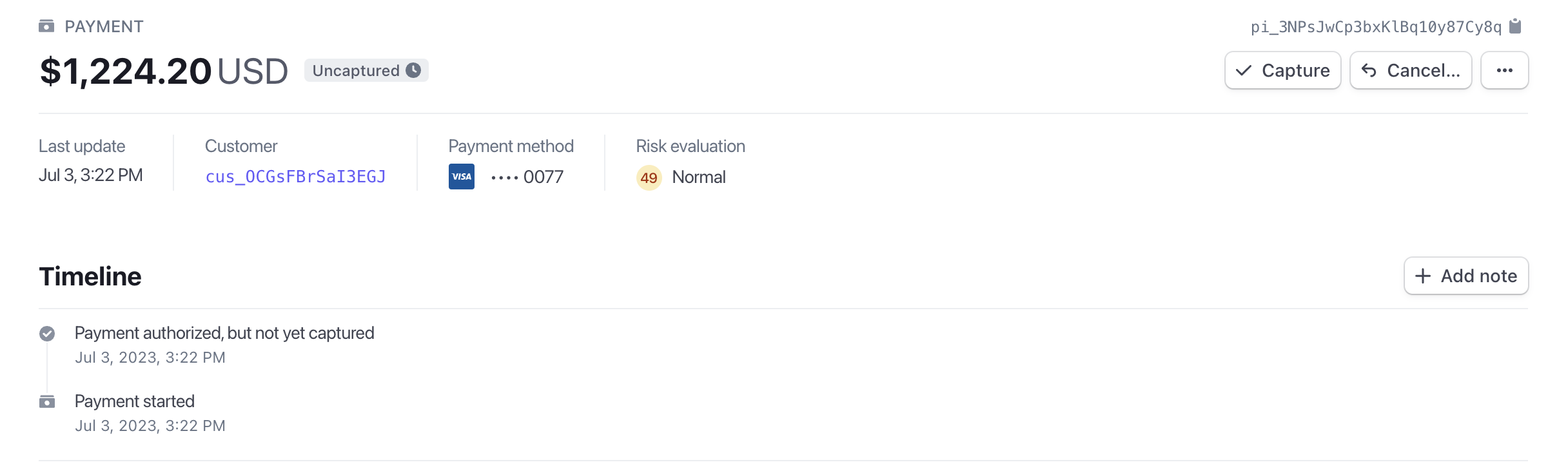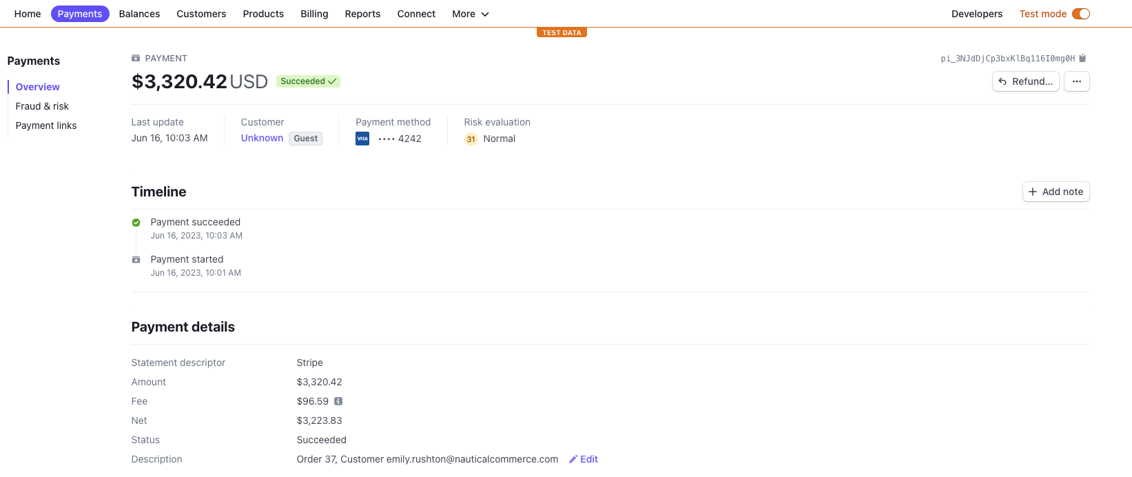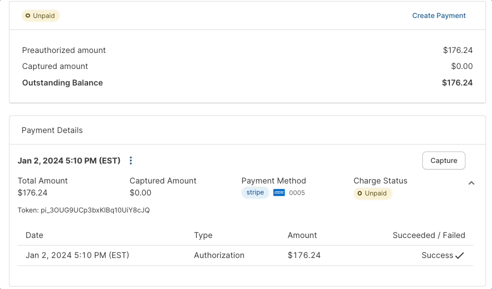 When automatic payment capture is enabled, payments are captured upon checkout and shown in Stripe in the Succeeded state to indicate the payment is complete.