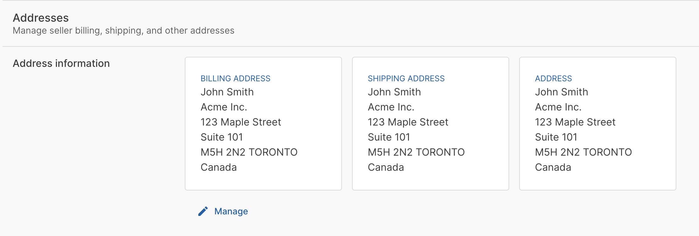 The following mutation creates a seller, with a seller admin user, and passes information for both a defaultBillingAddress and defaultShippingAddress: