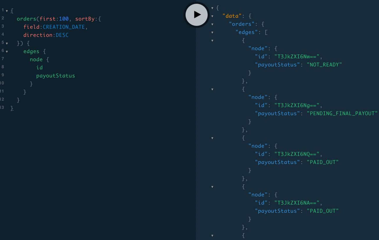 Let's assume you, as a Marketplace Operator, have a bunch of orders already. We can check the Payout Status of our Seller Orders by using the orders query, as so: