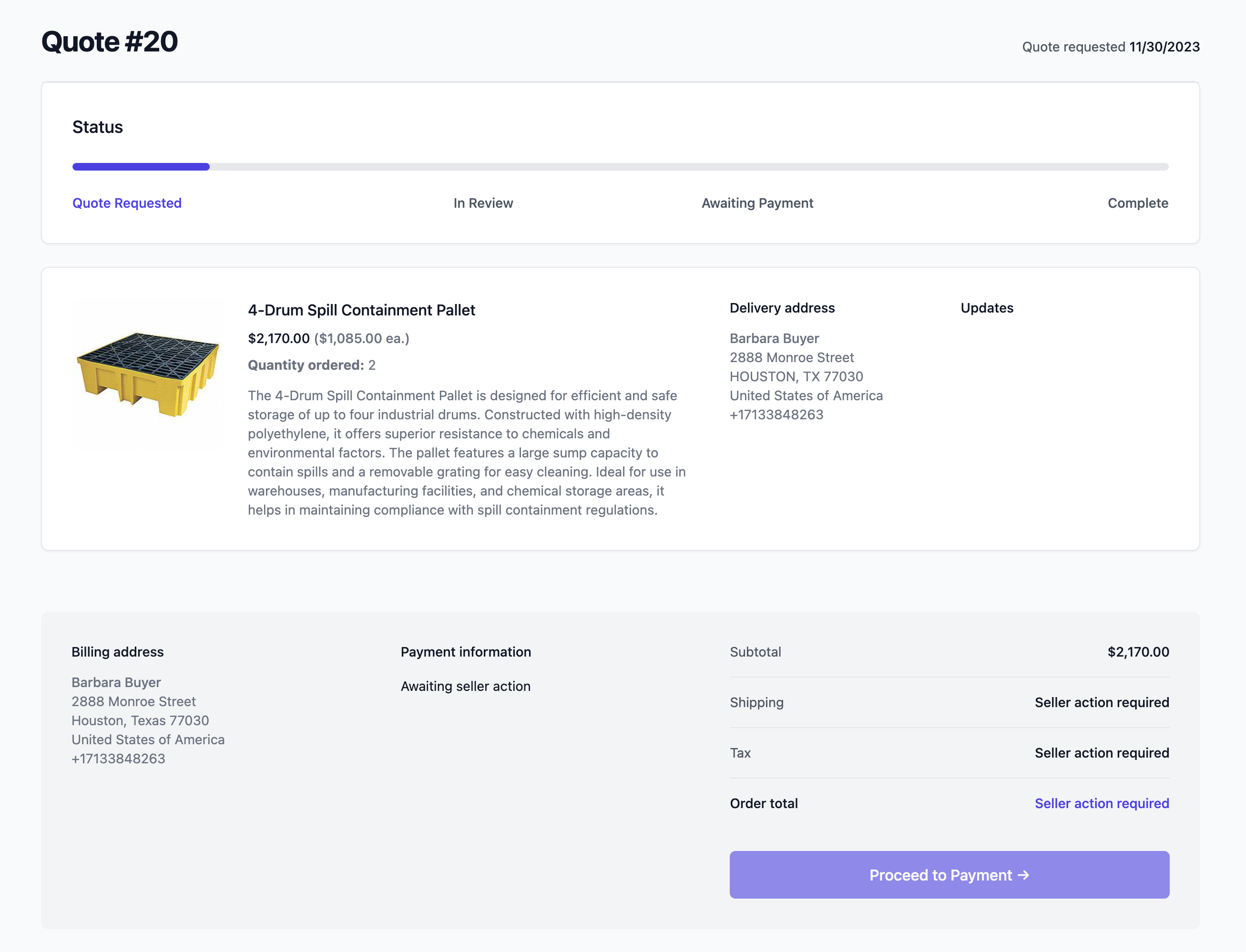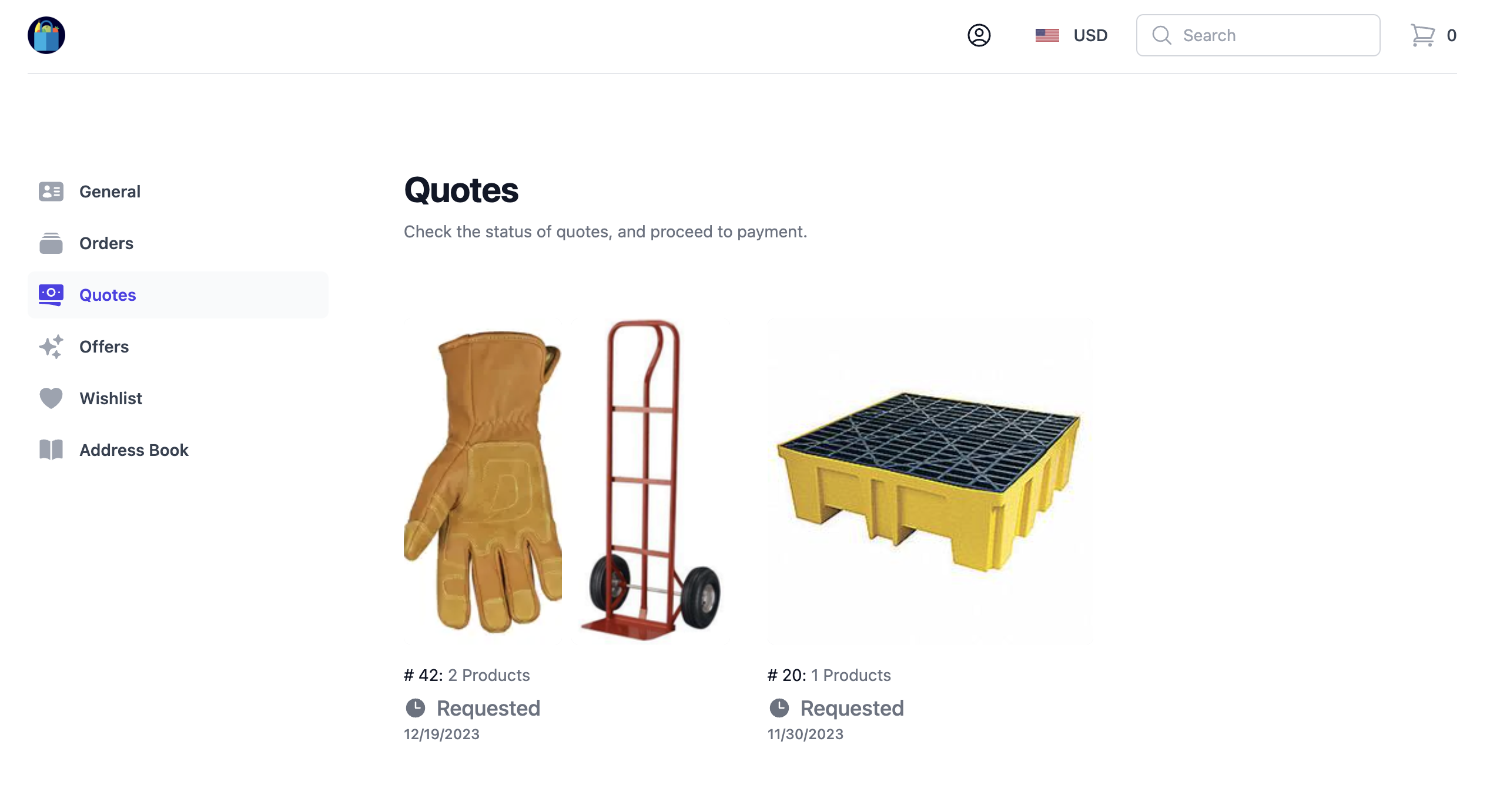 Buyers can proceed with traditional checkout and payment, or request a quote.