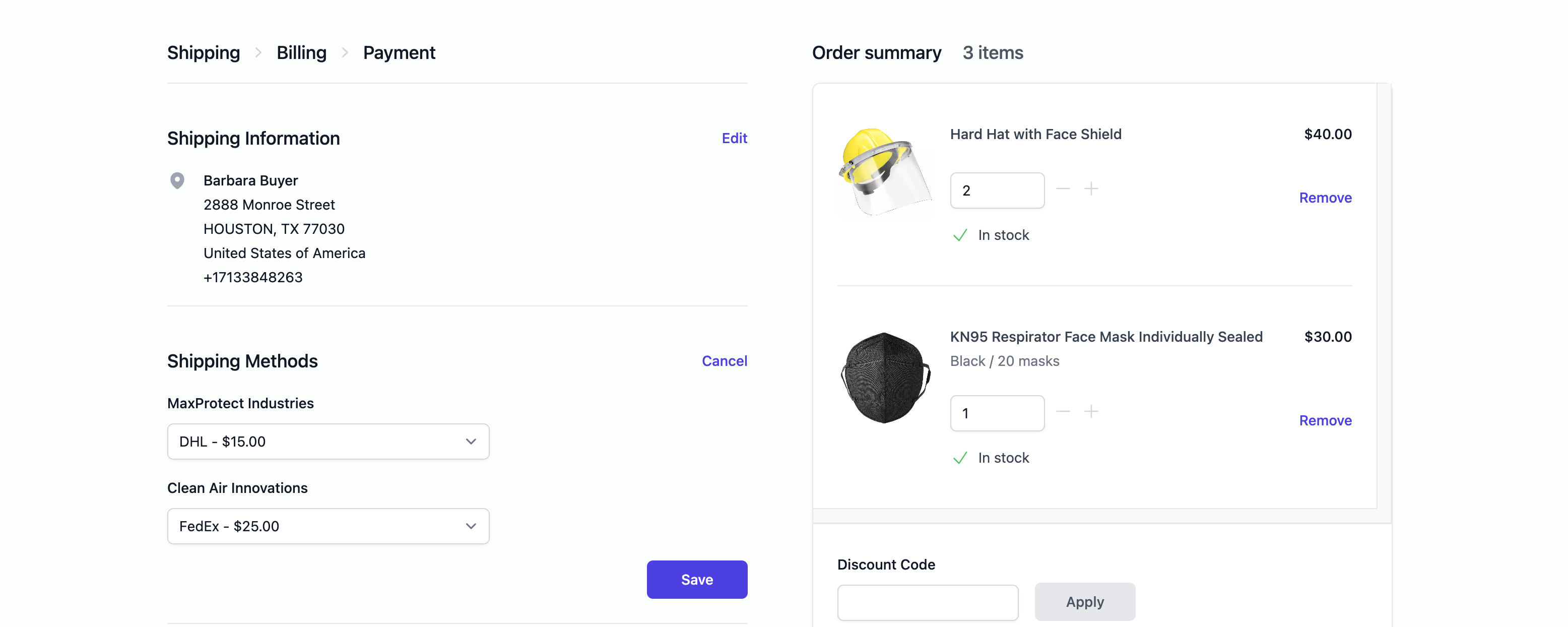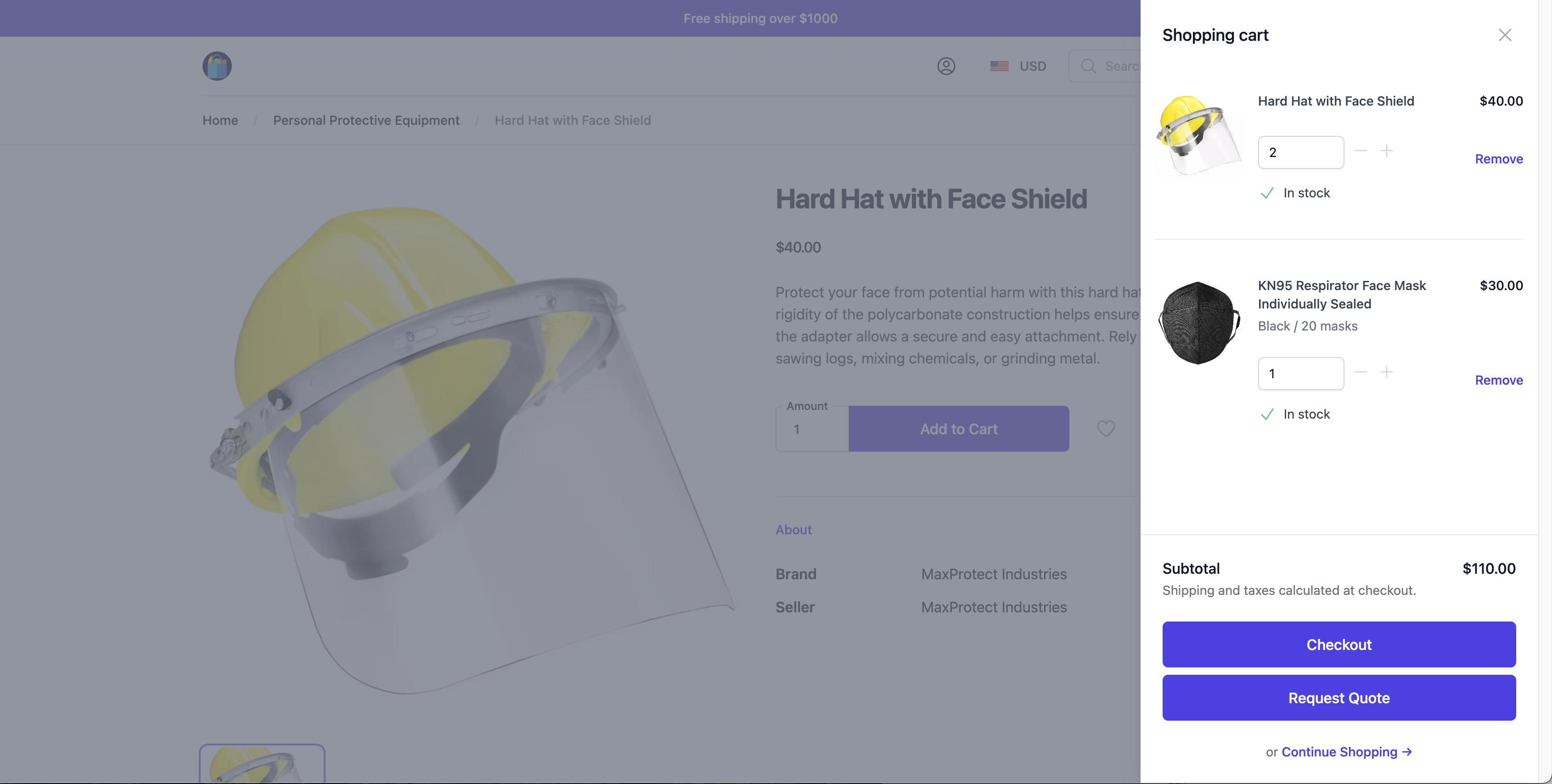 Buyers can proceed with traditional checkout and payment, or request a quote.