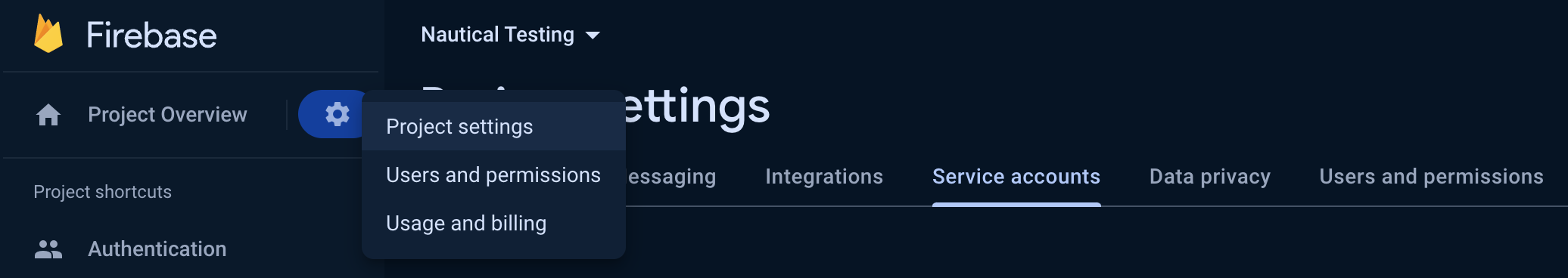 - From Firebase Console, select the Gear menu and go to Project Settings -> Service accounts.
