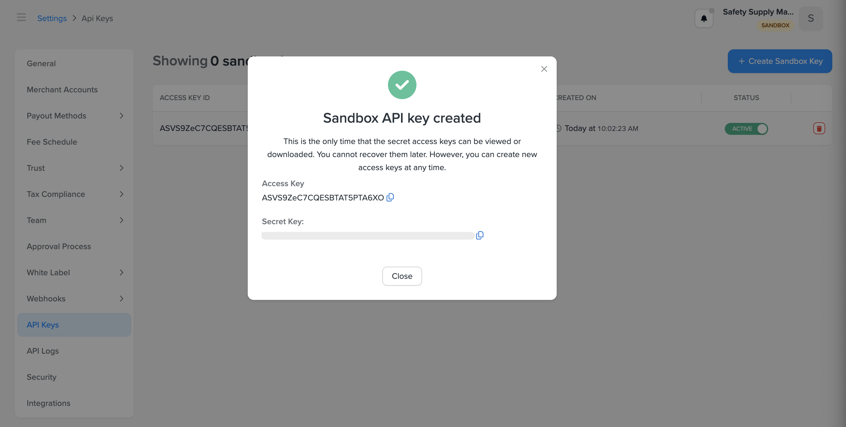 - Copy the Secret Key before closing the window. You can only view the secret key once after creating the API key.