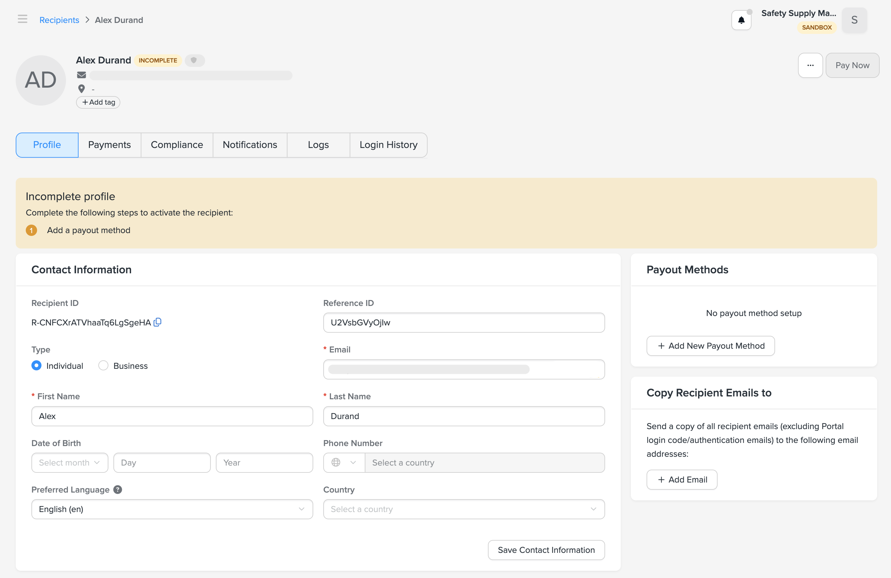 The recipient profile is not complete until you add a payout method. You can either add this information manually from the recipient profile in Trolley, or direct sellers to your Recipient Portal to add this information themselves.