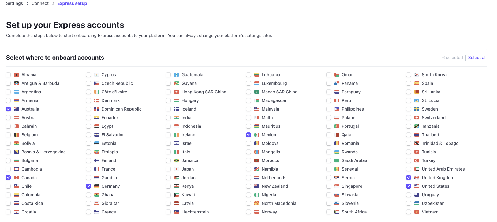 As part of setting up payouts with your payout gateway, such as Stripe Connect, you need to choose which countries you will allow sellers to onboard from.