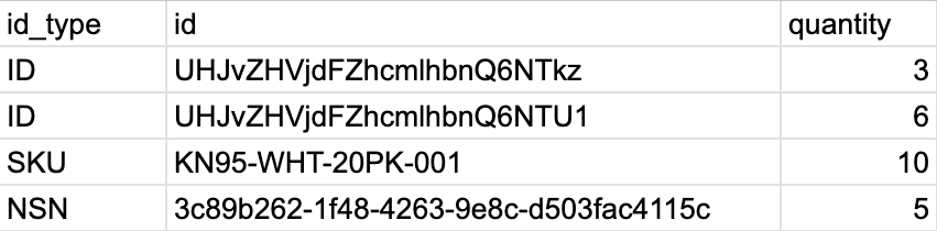 The file must be formatted with the id_type, id, and quantity fields. All three values are required to add an order line. See the following example: